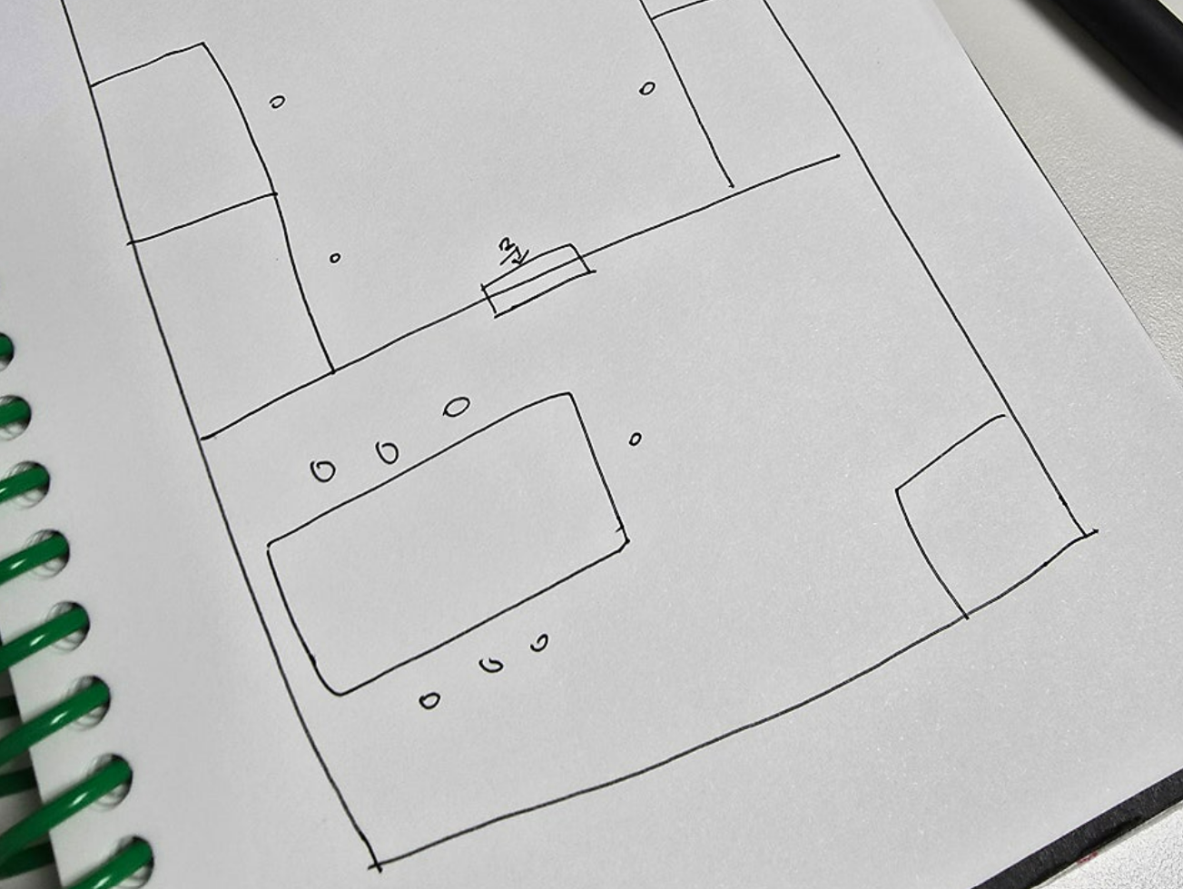 相談の中で代表は下のようなラフスケッチを描き、希望するレイアウトを説明しました。このスケッチがArchisketchと出会ったらどうなるでしょう?