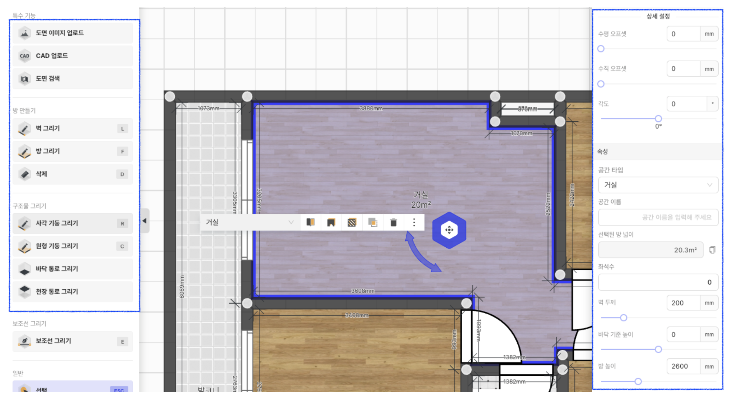 공간에 기둥을 넣거나, 천장에 몰딩을 추가하는 등 세부적으로 작업해야할 때가 있거든요. 그런 기능을 다 지원해줘서 좋아요. 그리고 아파트에 실사를 나가보면 면적이 조금 다른 경우가 있는데, 공간 넓이, 벽 높이 등을 상세하게 조정할 수 있어요.