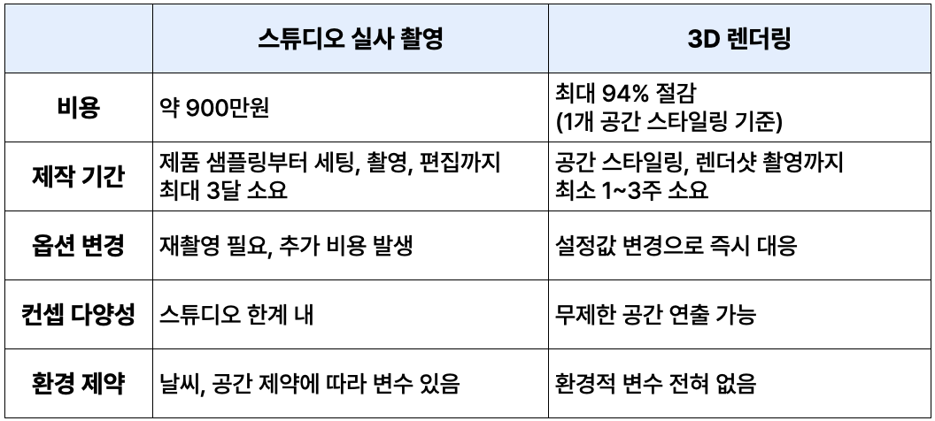 보시는 것처럼 3D 렌더링은 스튜디오 촬영 대비 비용이 94% 절감이 될 뿐 아니라 더욱 편리하기까지 한 것을 알 수 있었습니다. 촬영장과 같은 물리적 공간 제약으로부터 자유로울 뿐 아니라, 날씨에 관계 없이 작업이 가능하기 때문입니다.